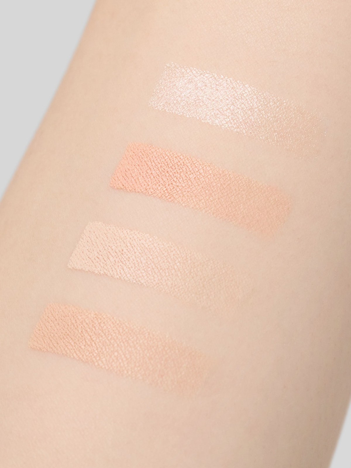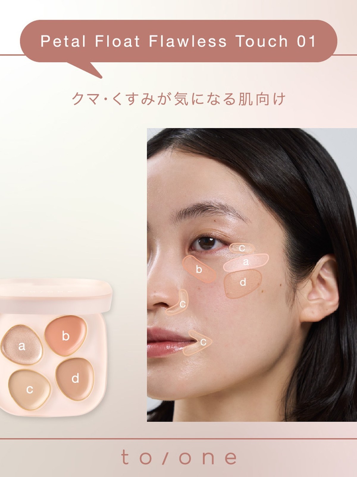可依個人當日肌膚問題使用 輕鬆打造完美妝容 輕盈觸感油的均衡搭配 帶來順滑的乳霜質感和極佳的附著力 即使沒有技巧 也不會起皺或出現不均勻 輕鬆打造自然美麗的妝容 a:高光澤色調(米色光澤) 塗在想要打造立體感的區域 例如臉頰高點、眼角、鼻樑和上唇尖,增添精緻光澤 b:控色(珊瑚米色) 遮蓋眼下藍色和棕色眼袋,打造活力妝容 c:控色(淺米色) 在令人擔憂的暗沉區域,例如提亮嘴角、法令紋、淚溝 增添健康光澤,微妙地提亮膚色 d:遮瑕膏(中性米色) 牢固遮蓋瑕疵和痘印 也可與 c 混合使用