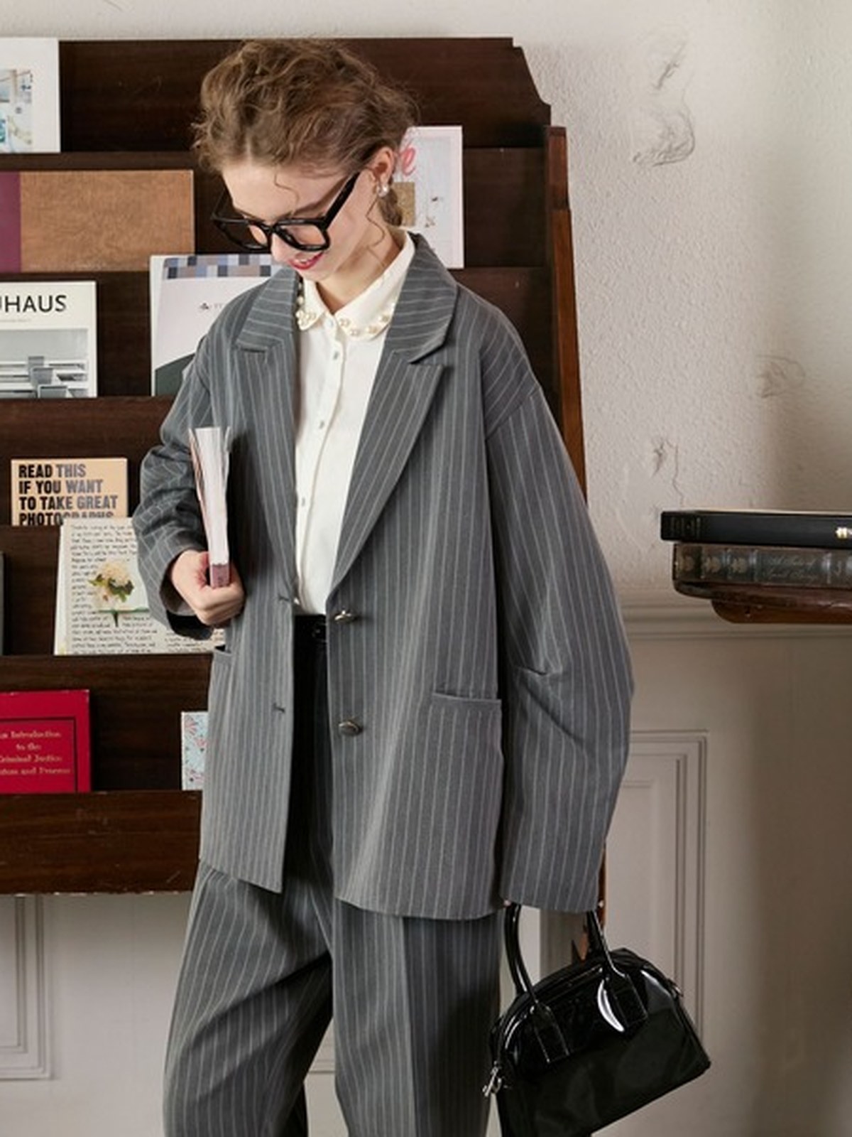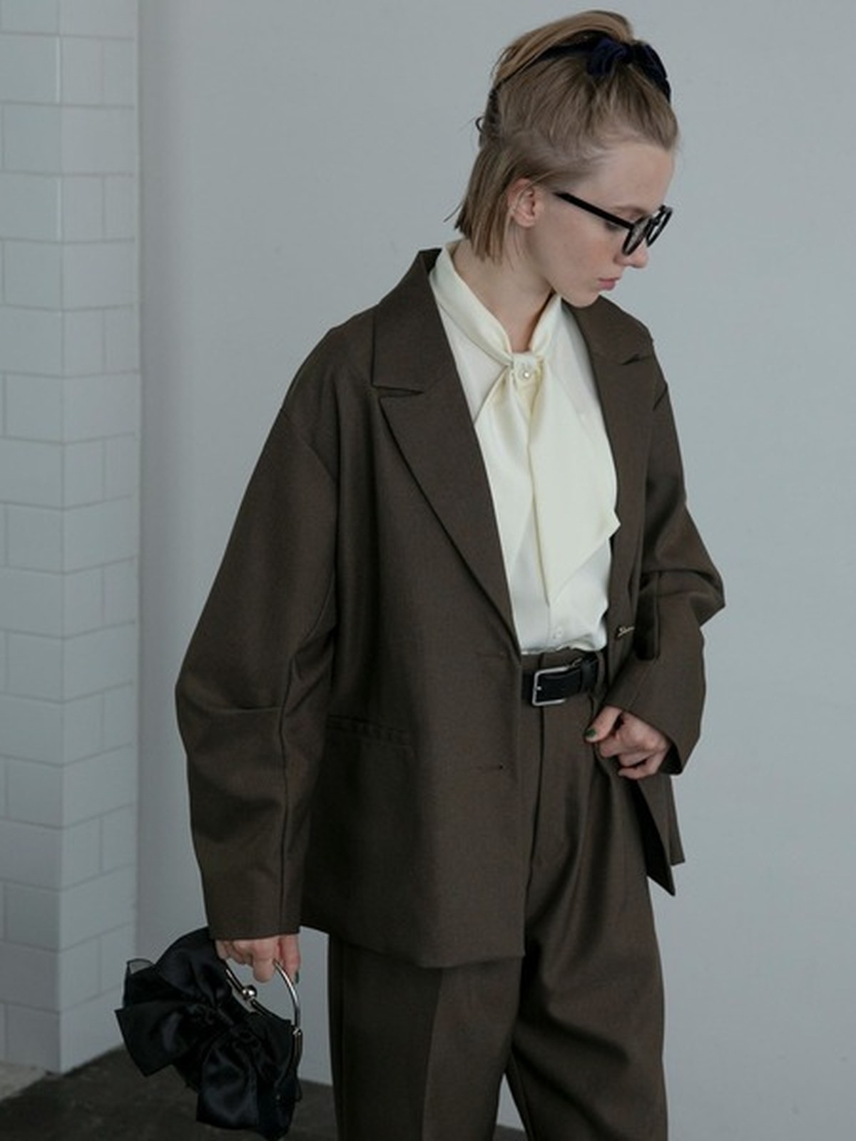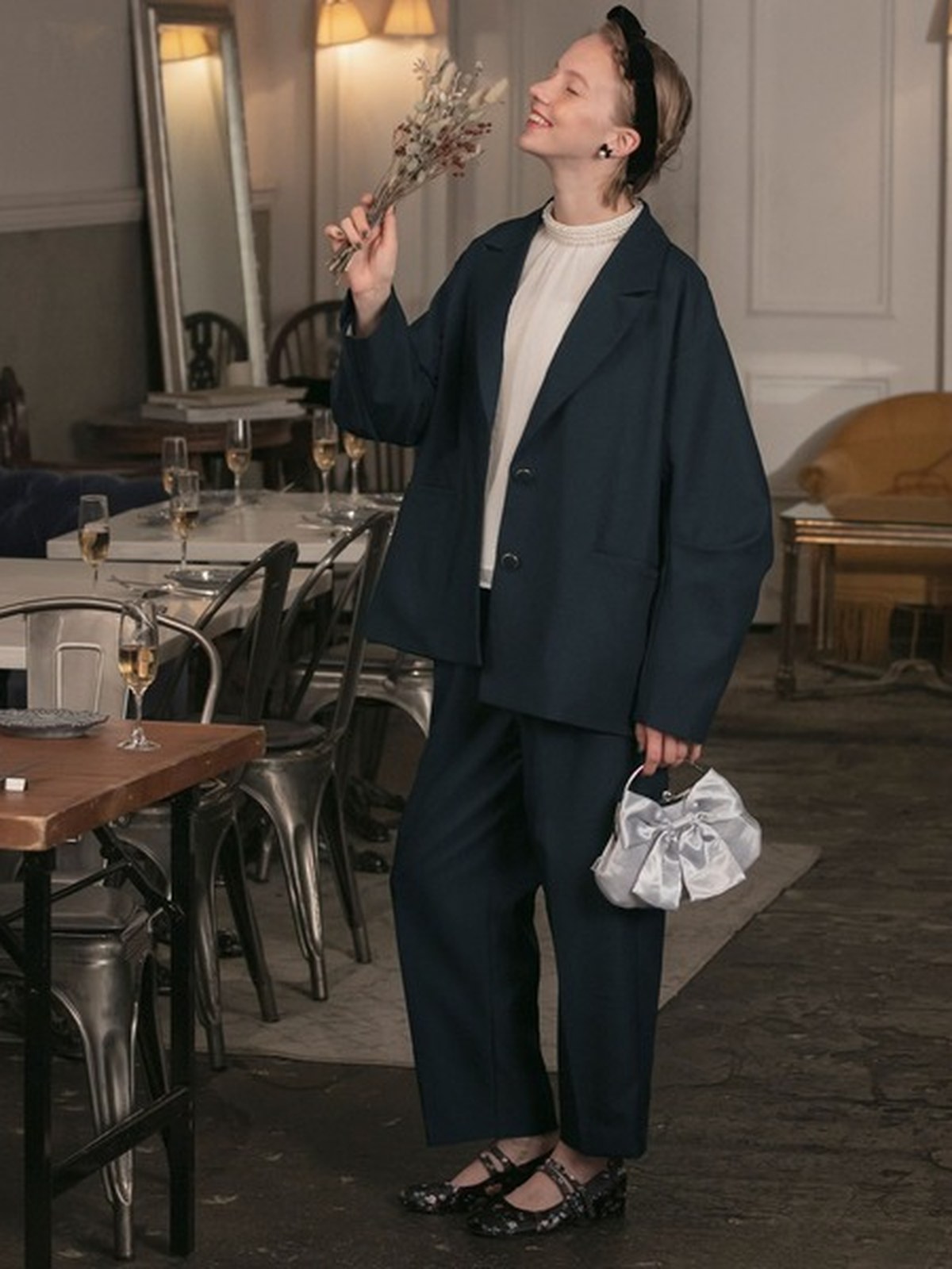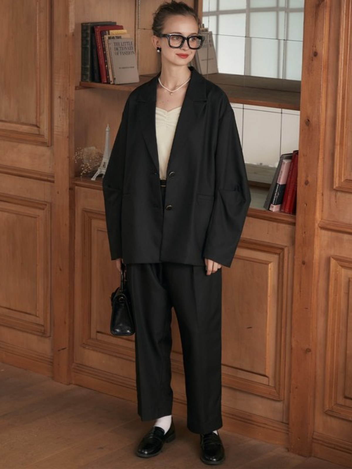 套裝包含西外+西褲 <西外> ・開衩蝴蝶結設計增添魅力。 -超大廓形,打造休閒造型 - 袖子上的褶襉設計營造出時尚的輪廓。 - 較長的長度可遮蓋臀線,打造迷人身材 - 金邊紐扣,經典外觀 - 附實用口袋 - 適合正式場合的剪裁風格 <褲子> - 直筒廓形,適合搭配任何服裝 ・高腰與中壓設計,讓您的雙腿更加美麗 ・後鬆緊設計,穿搭舒適