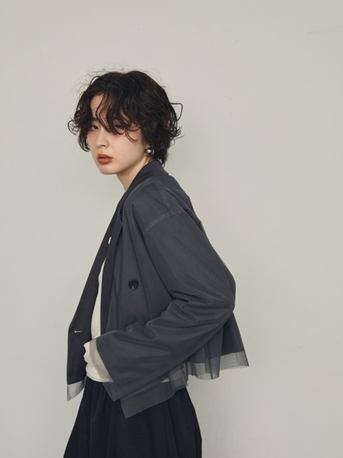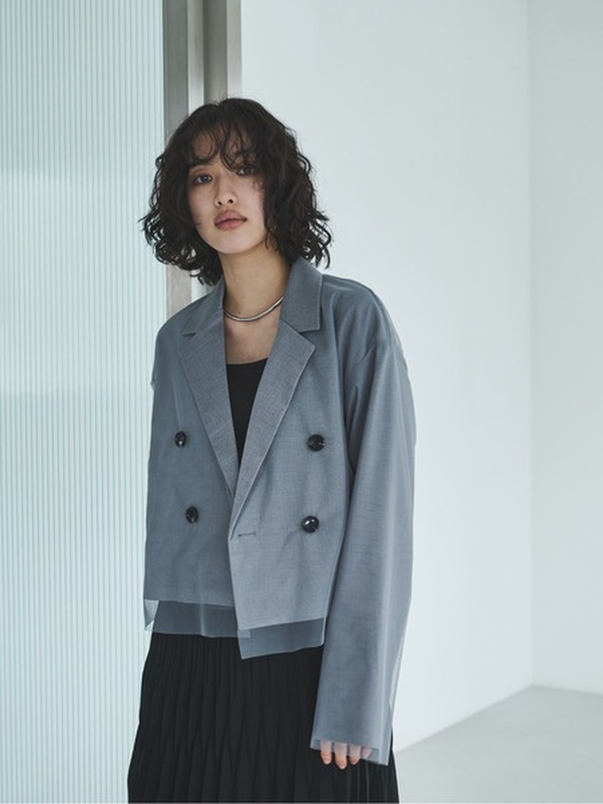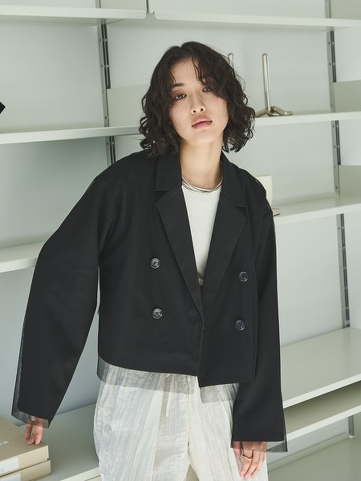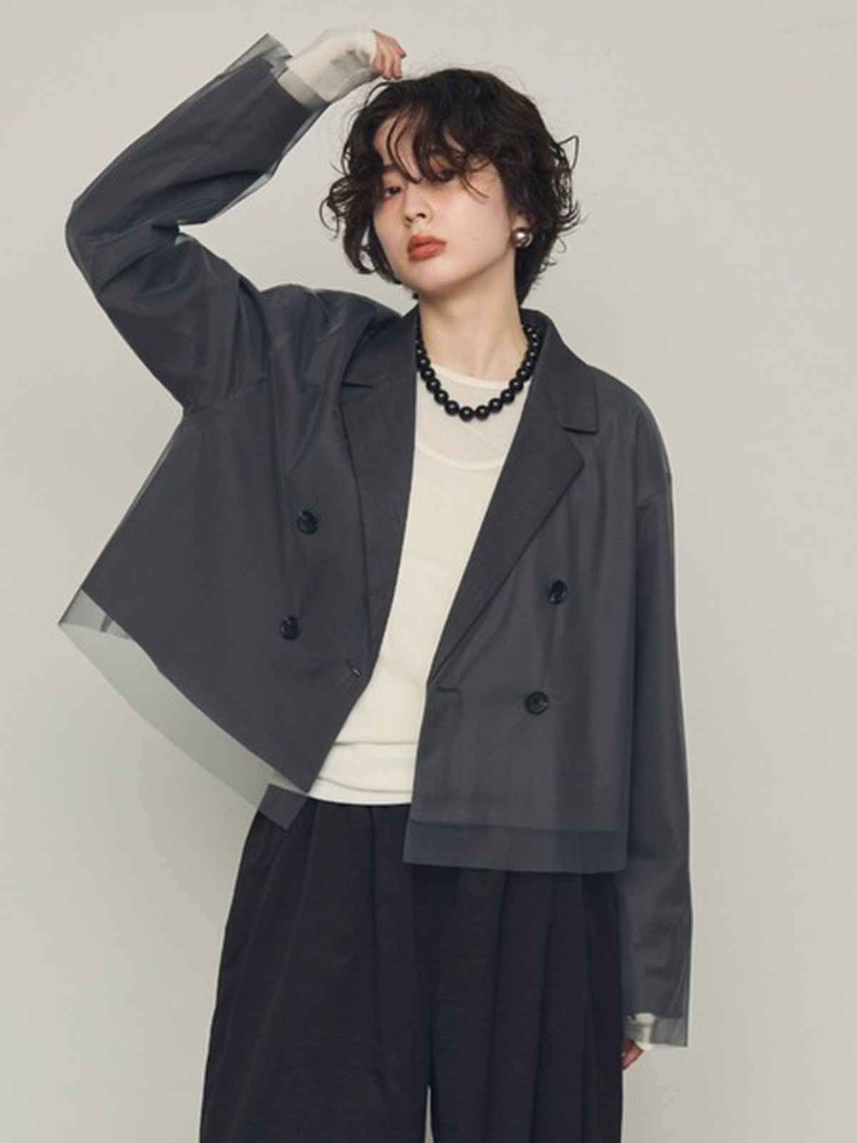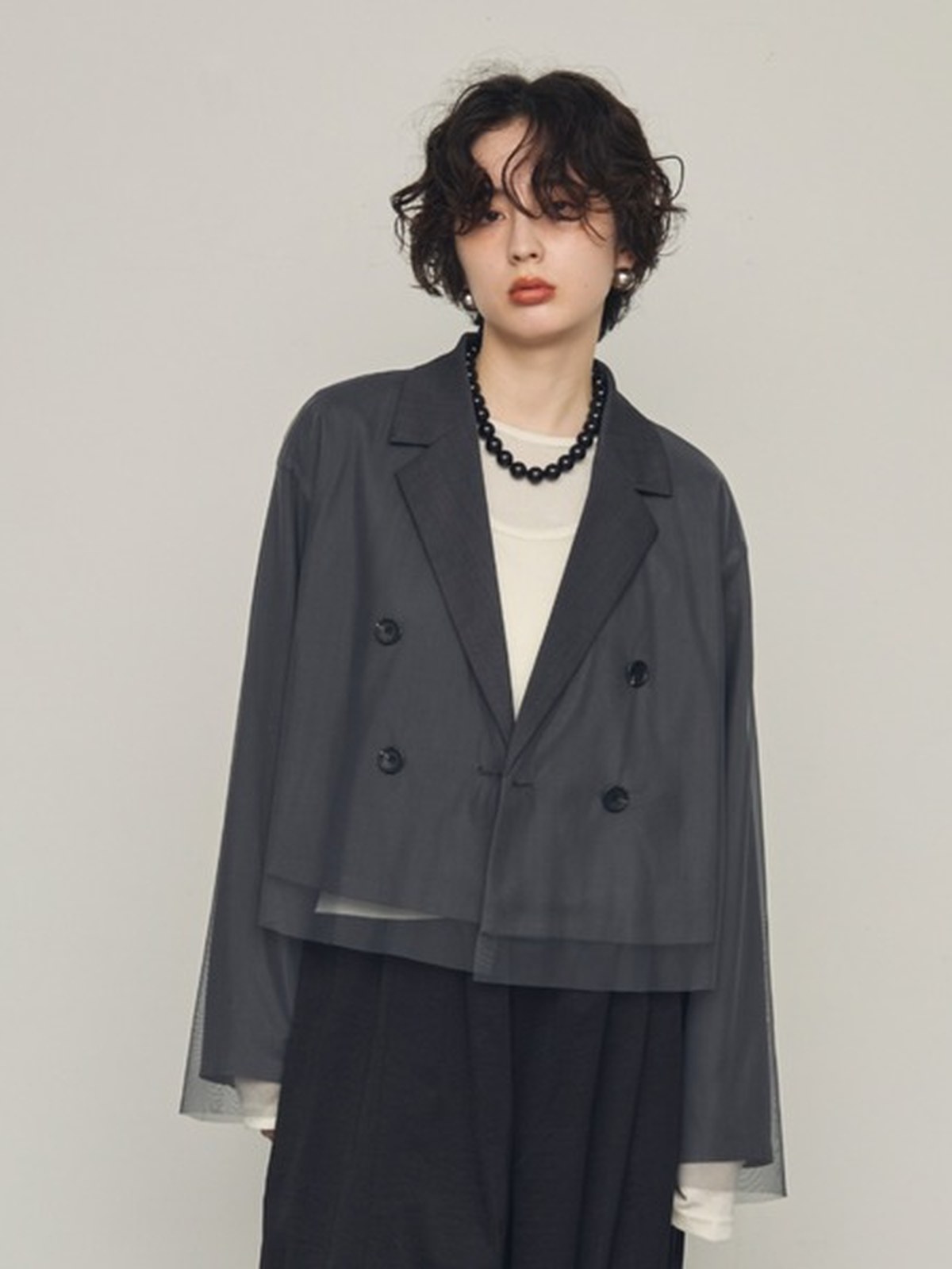 一件多功能外套,可適合任何場合。 只要穿上它,您就會擁有精緻、輕鬆的外觀! 外套頂部的薄紗增添了獨特的韻味。 短款的長度也有著極佳的顯瘦效果。