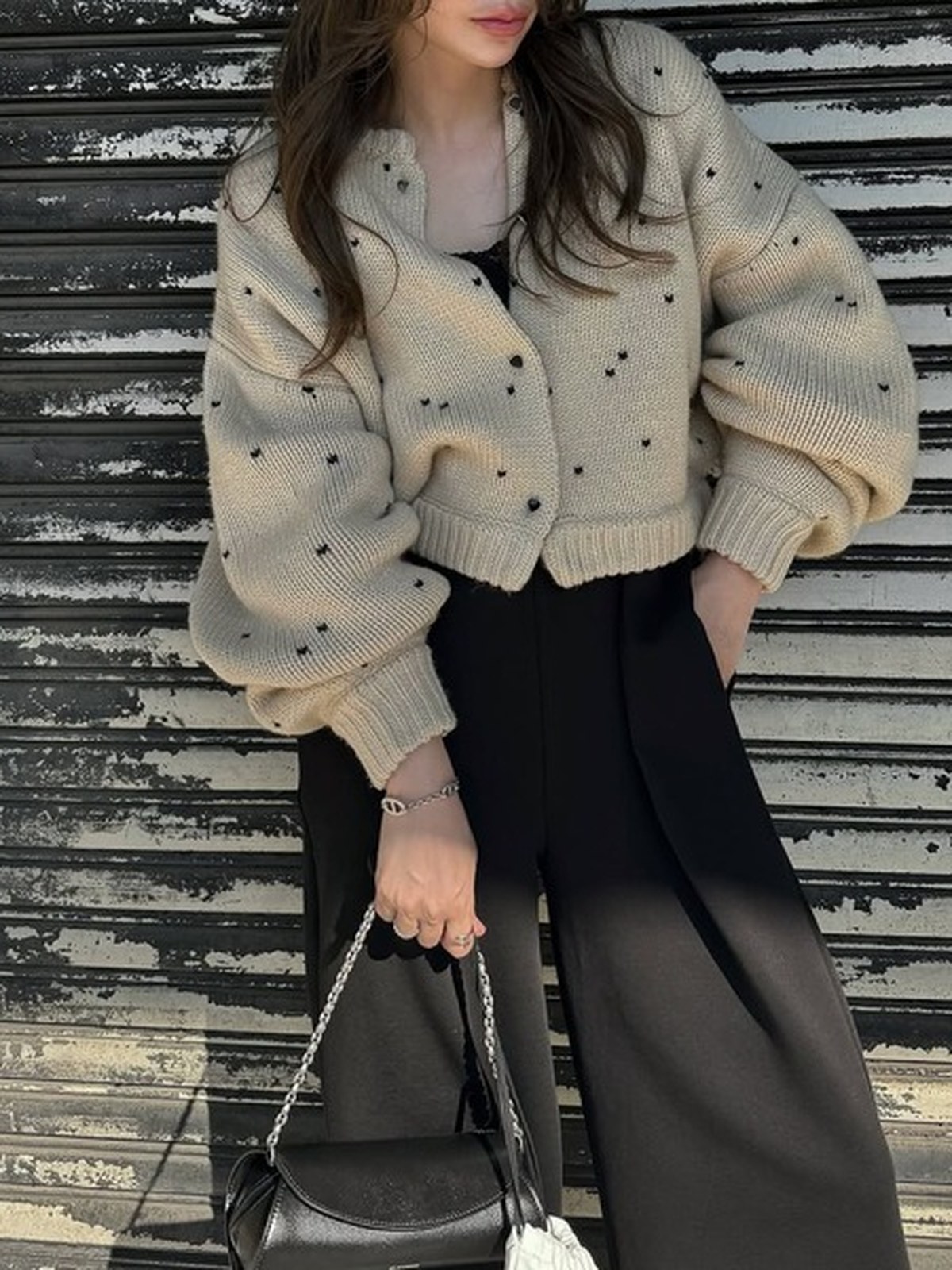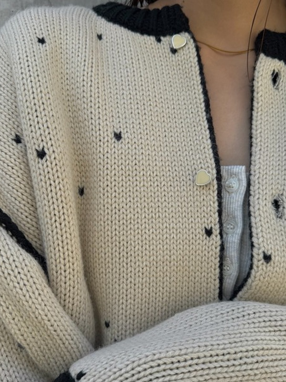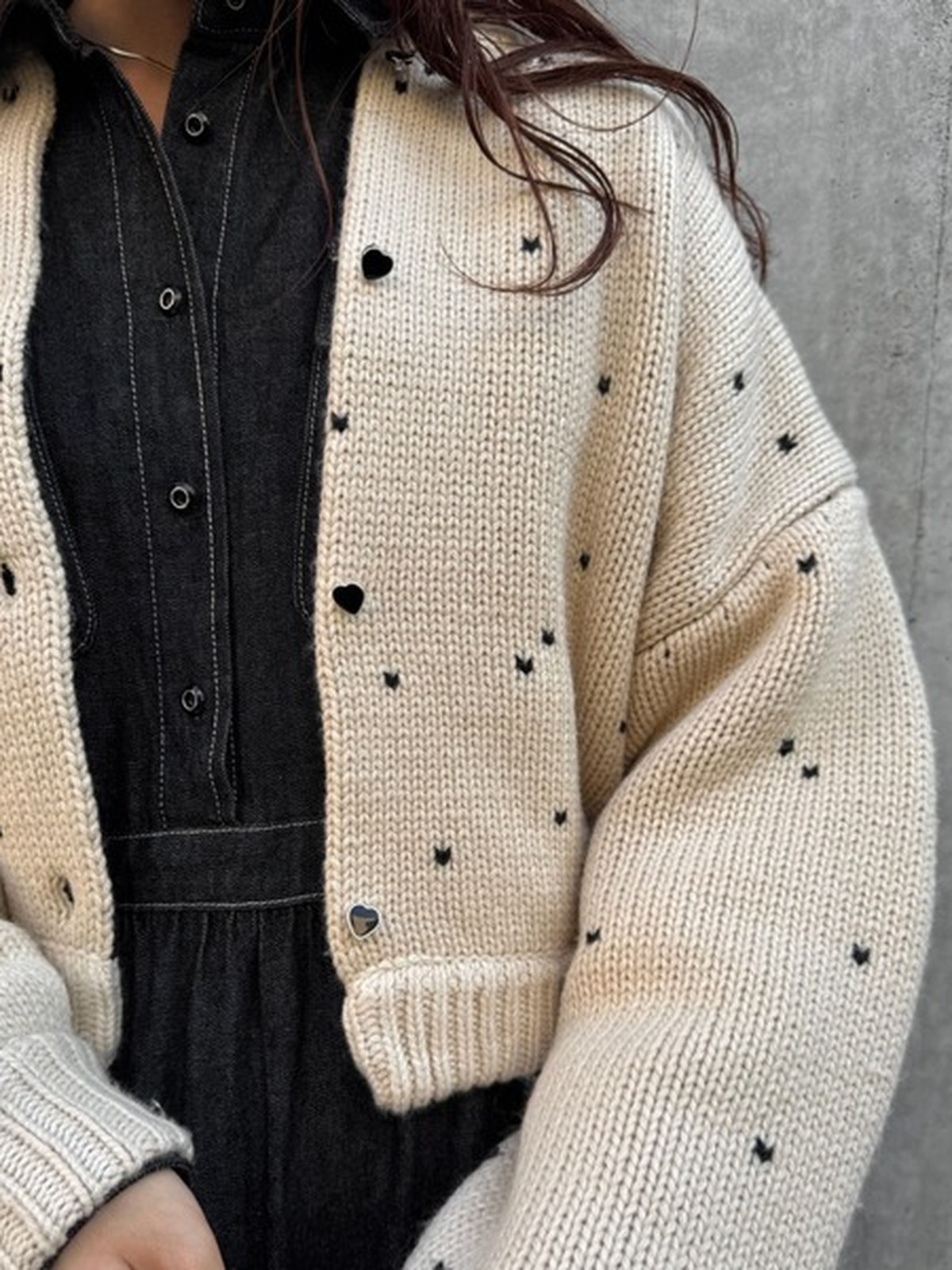 人氣愛心圓點提花雙面短款針織開衫的升級版 - 採用雙面提花針織工藝,呈現愛心圖案 - 雙面穿著時,撞色縫邊成為視覺焦點 - 同色愛心紐扣增添可愛氣息
