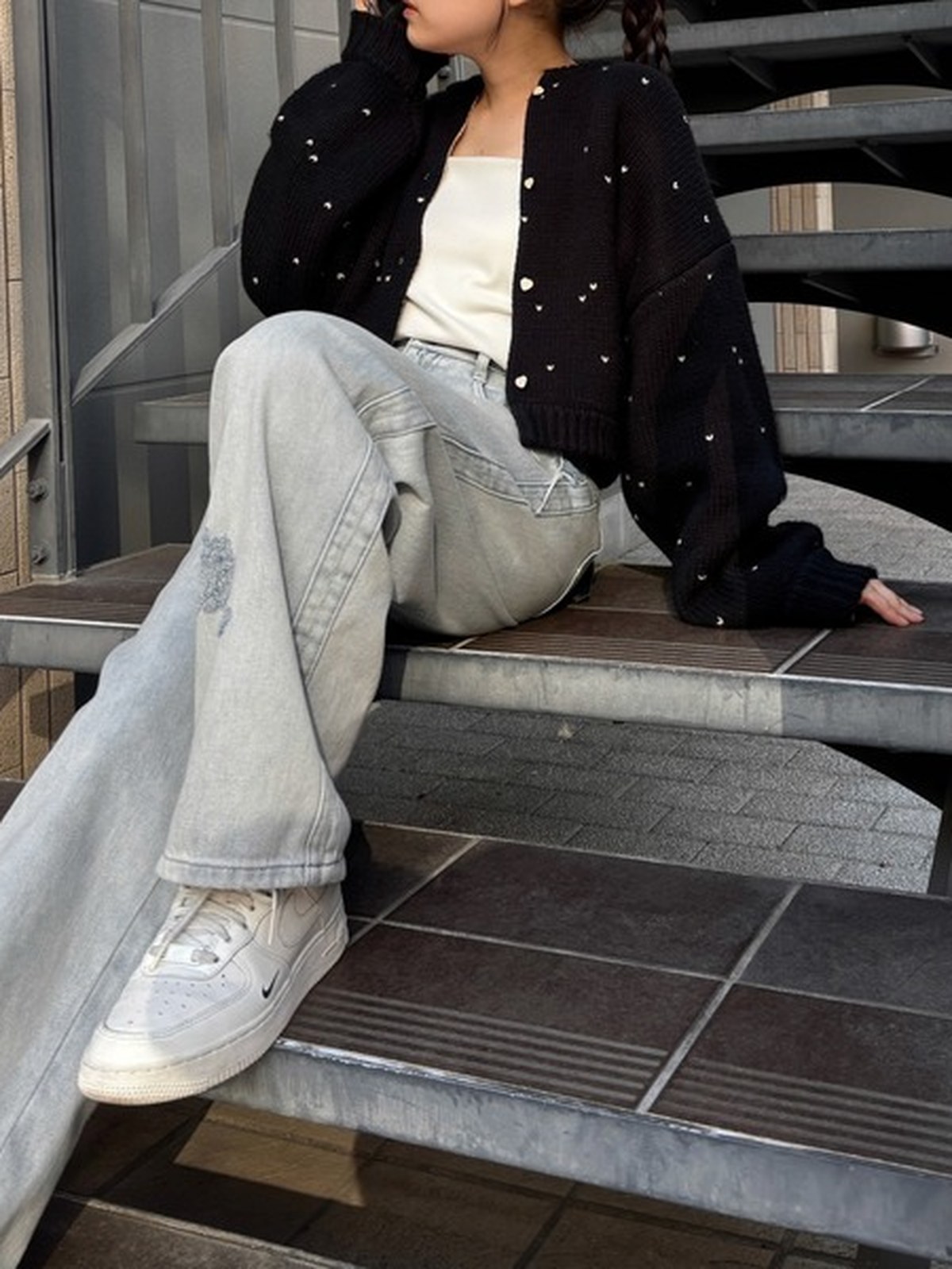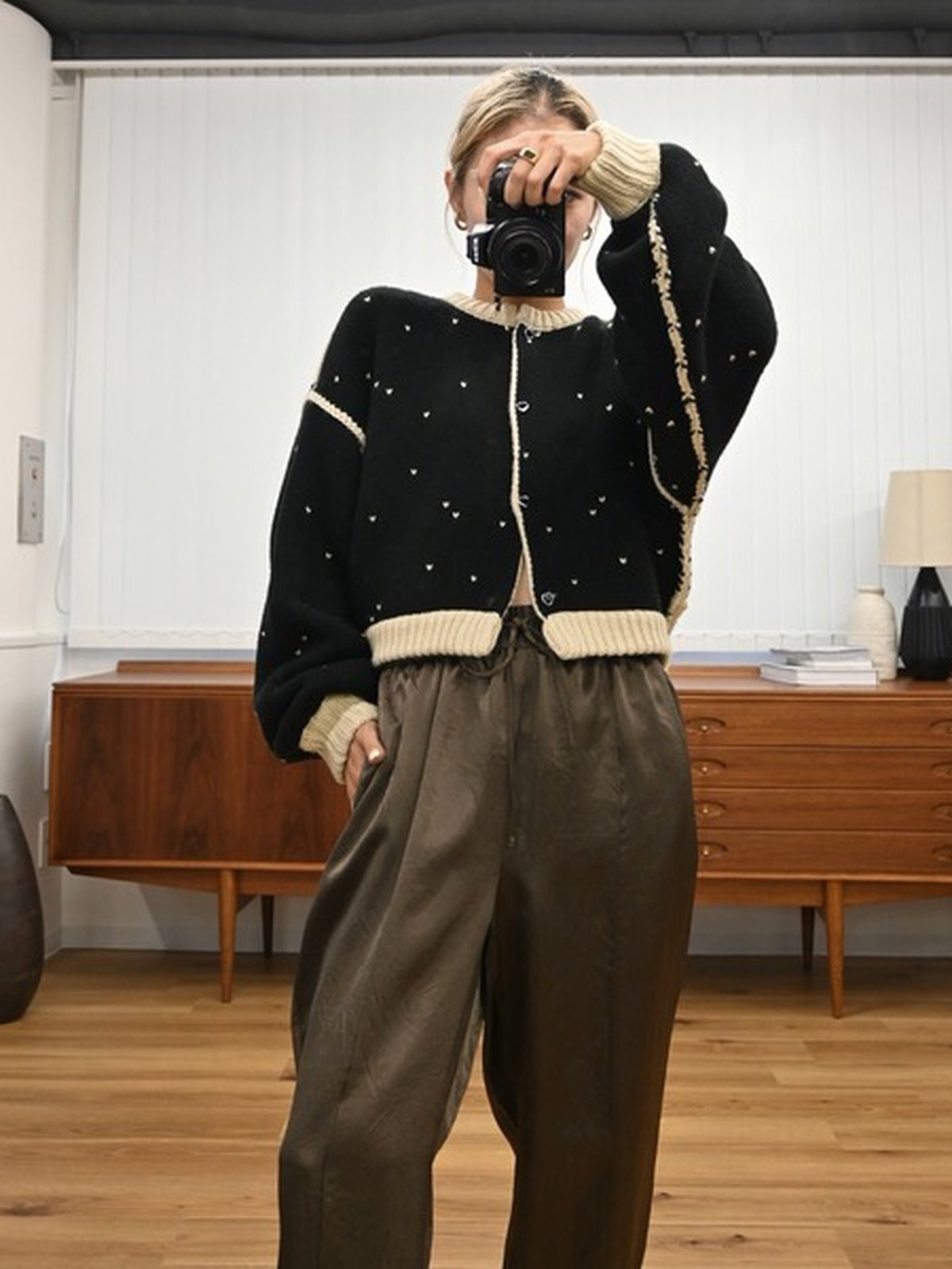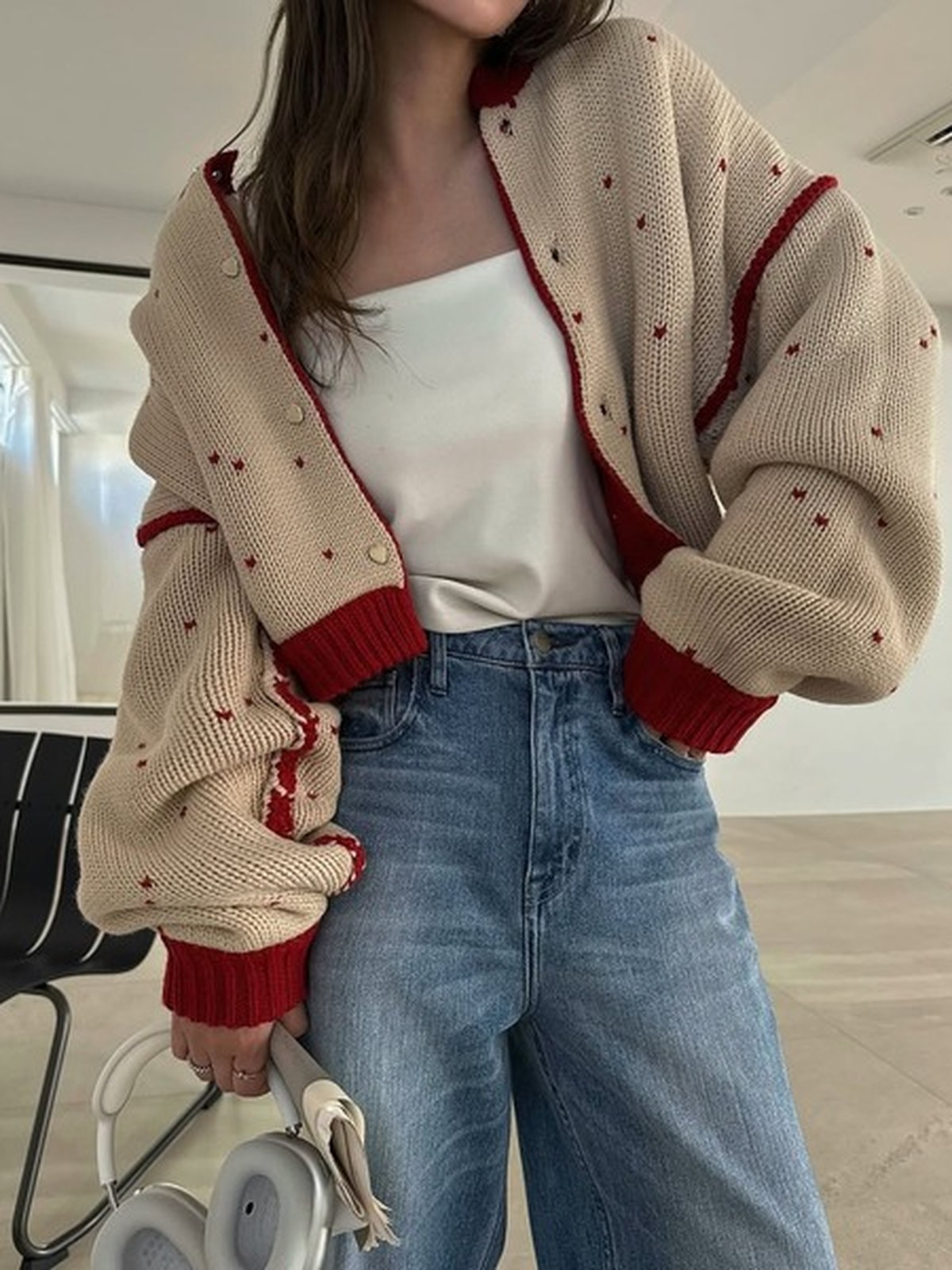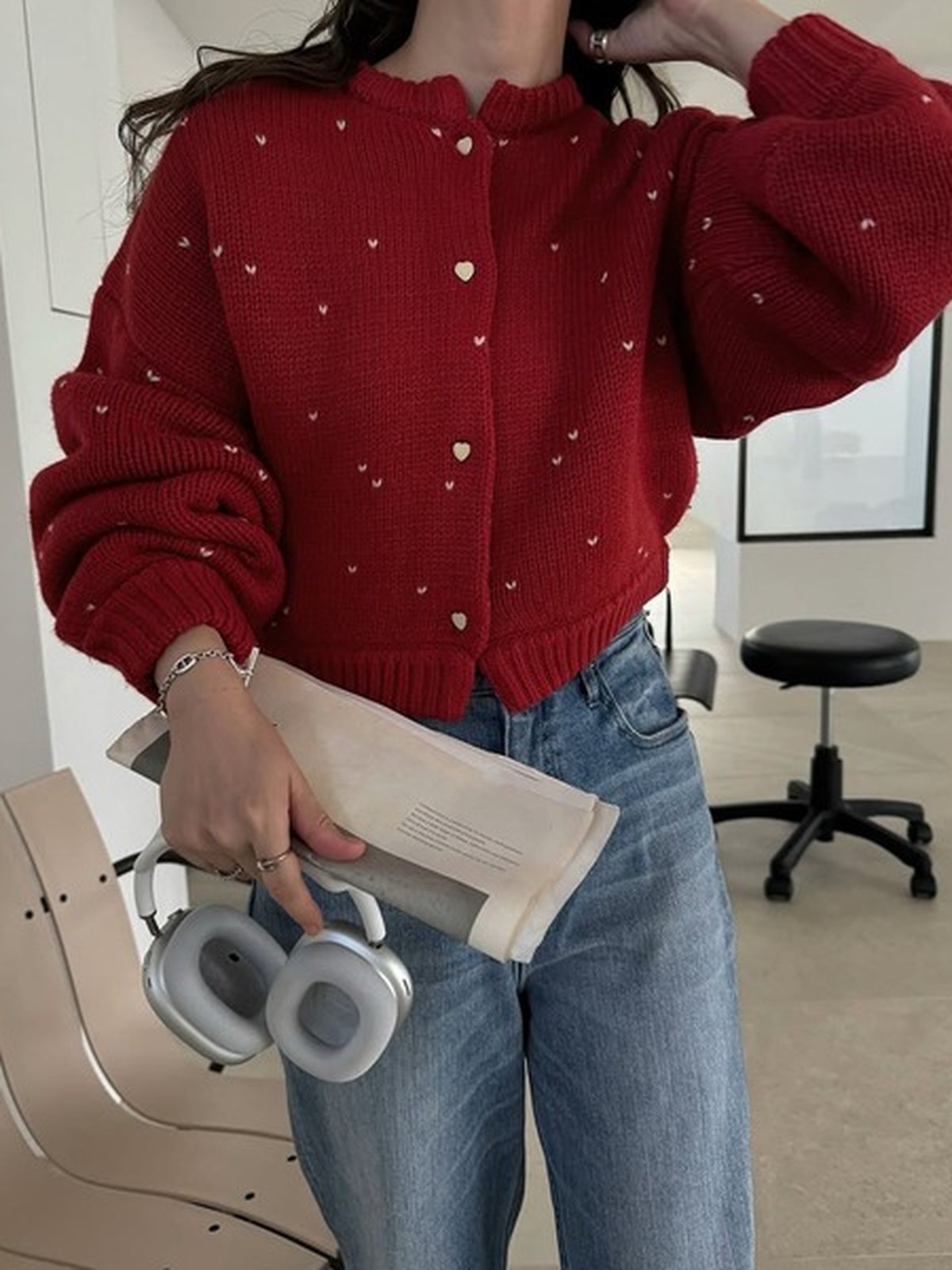 人氣愛心圓點提花雙面短款針織開衫的升級版 - 採用雙面提花針織工藝,呈現愛心圖案 - 雙面穿著時,撞色縫邊成為視覺焦點 - 同色愛心紐扣增添可愛氣息