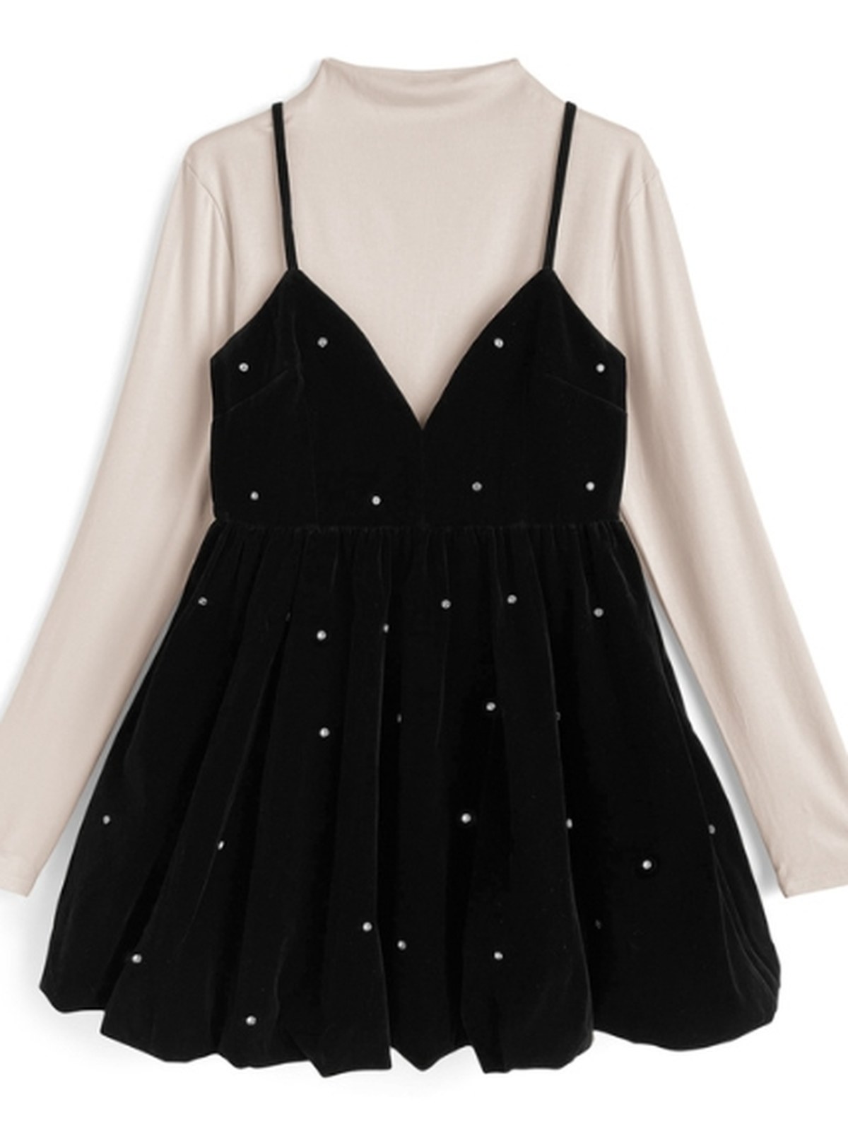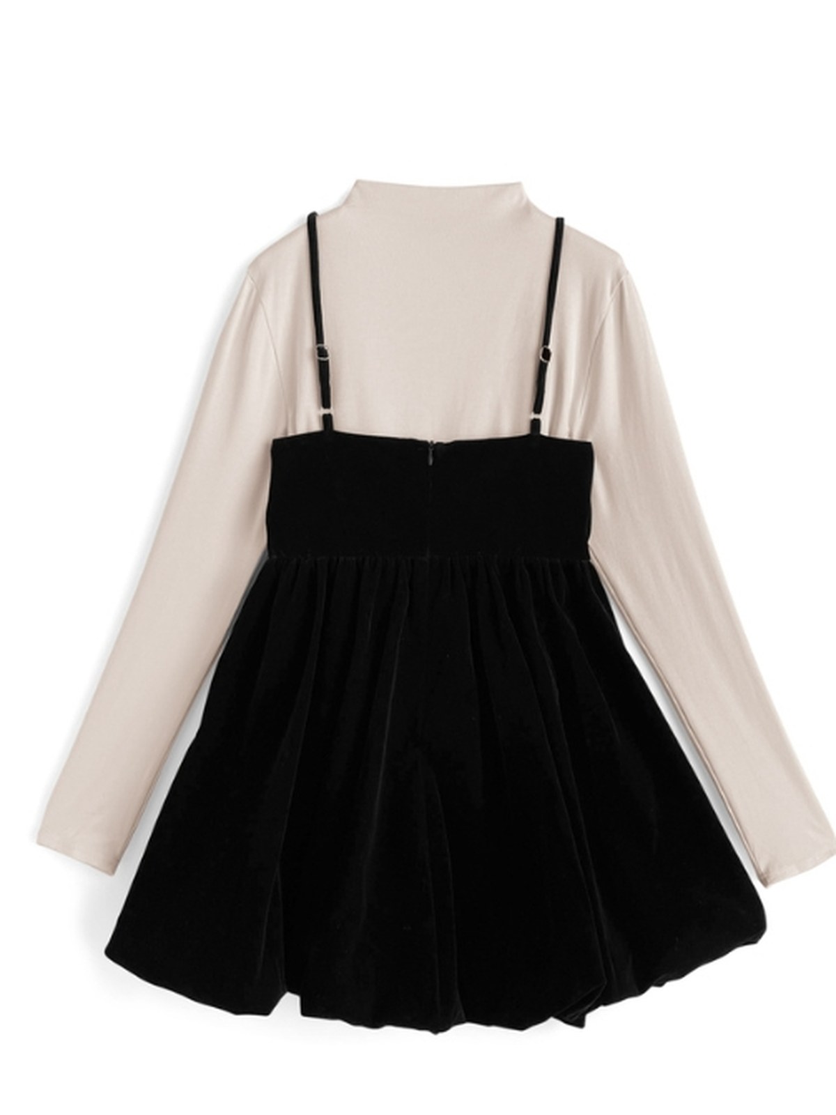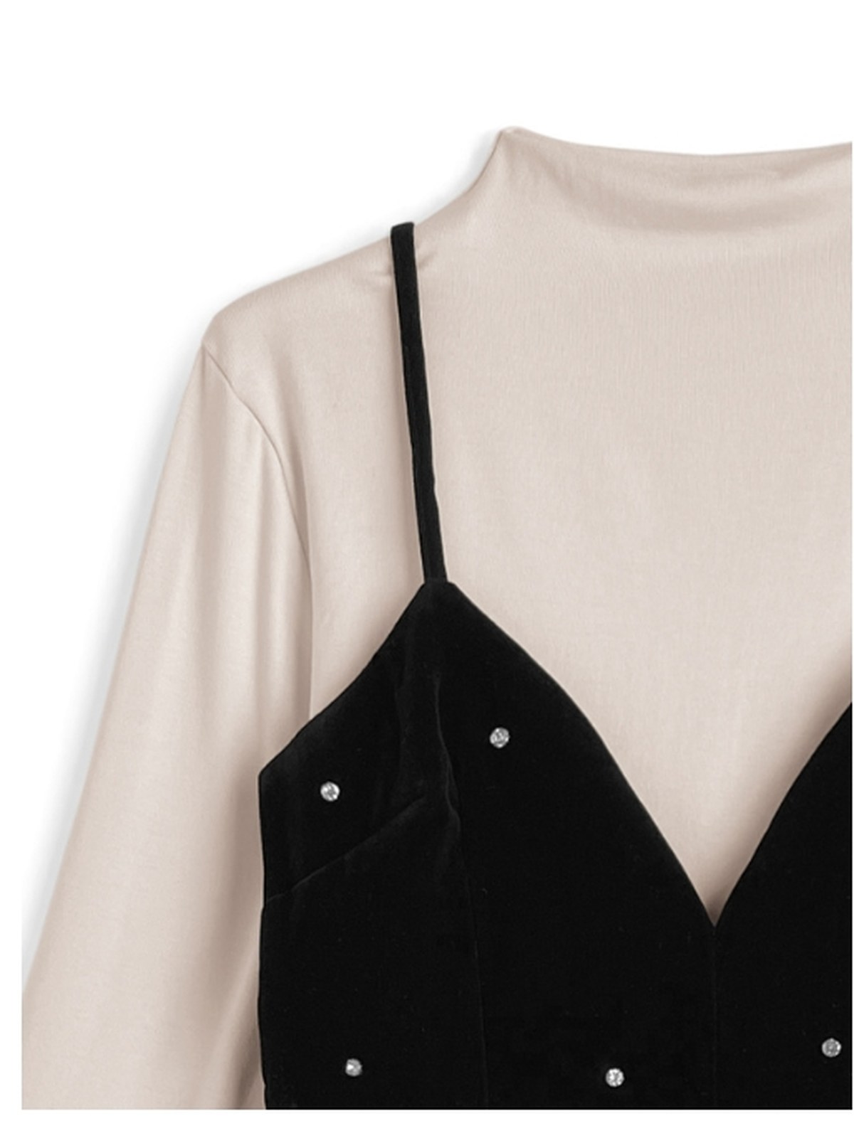 一套包含一件光滑上衣和一件質感奢華的絲絨吊帶連身裙。 連身裙飾有閃亮寶石,設計令人心動。 蓬鬆的燈籠裙擺更添優雅氣質。 基本款高領上衣採用輕盈彈性布料,穿著舒適。 兩件單品皆可單獨穿著,是拓展穿搭風格的理想選擇。